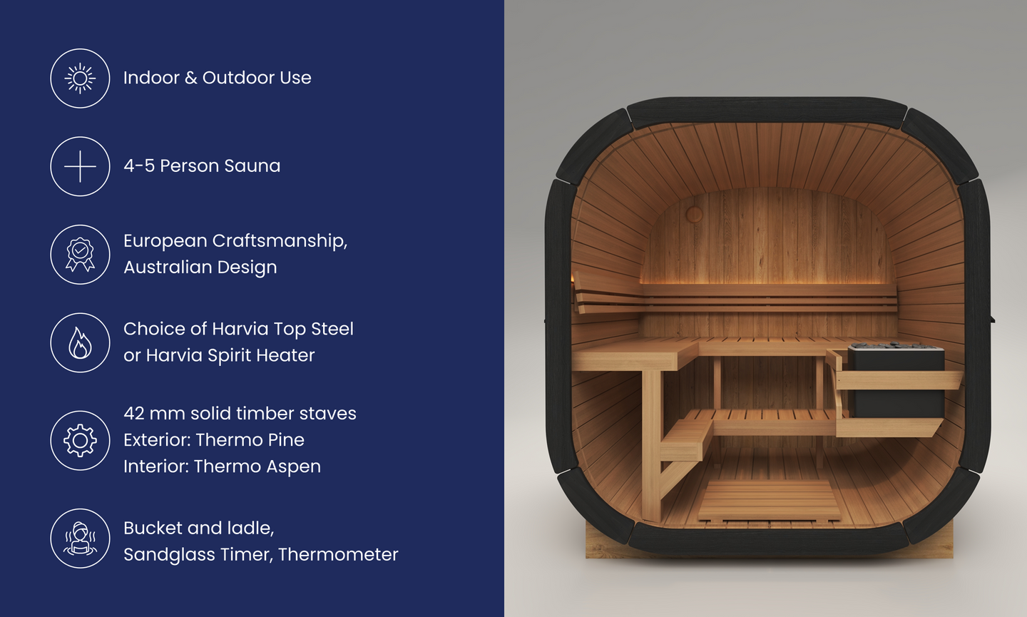 Heater Options: Harvia Top Steel 6 kW (built-in controls) or Harvia Spirit 6 kW (Xenio Wi-Fi controller)