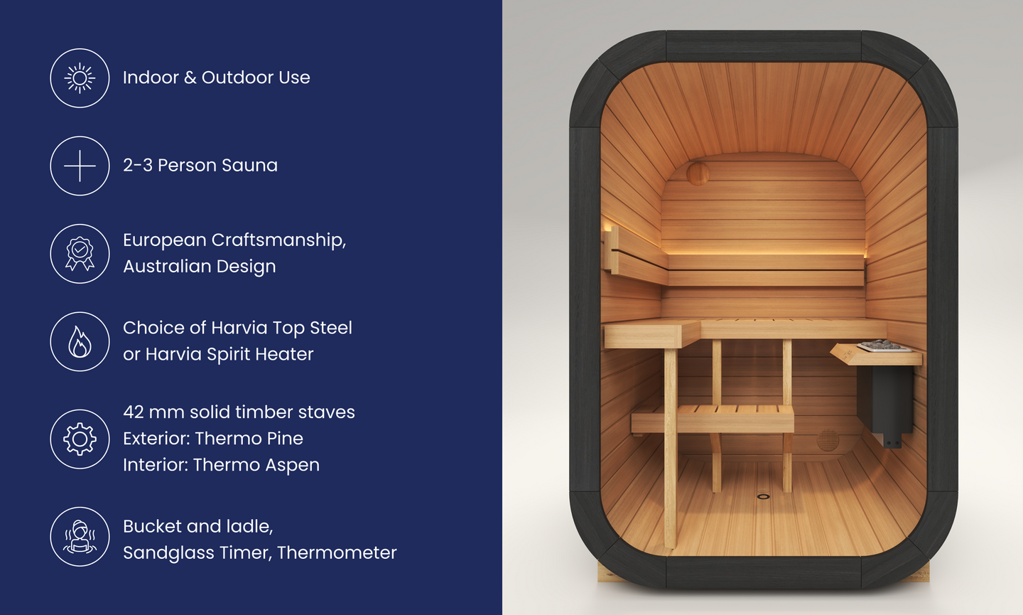 Handcrafted in Europe, the birthplace of sauna culture, our saunas combine generations of craftsmanship with modern Australian design. Built by skilled artisans using sustainably sourced, heat-treated timbers, each unit embodies authentic performance, durability, and European refinement.